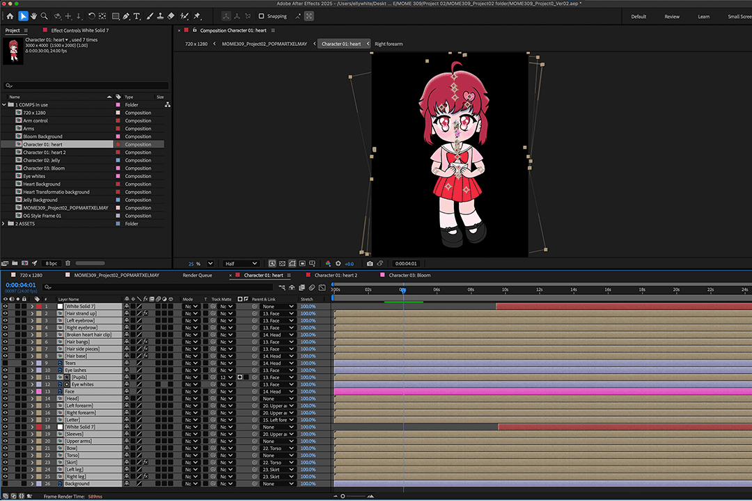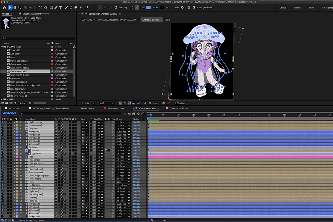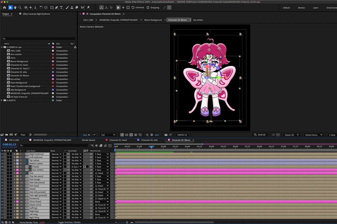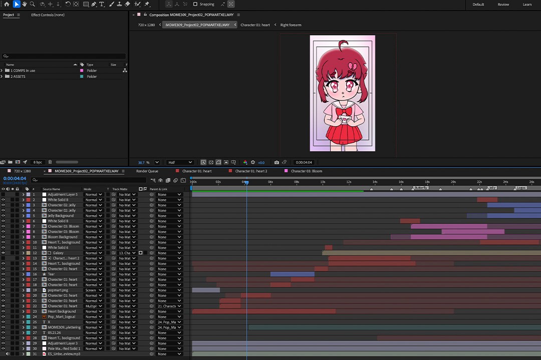 After exporting my illustration as a PDF into After Effects, I organized all my layers (renaming, adjusting anchor points, parenting elements, creating track mattes, and masking as needed). Once everything was set, I began compositing and animating. To make the characters feel fluid and alive, I used the Wave Warp and Puppet Tool effects. Wave Warp worked especially well for the hair, though it required a delicate balance to keep the motion feeling natural. My favorite part to animate, as always, was the faces, making them glance up, down, and around while adding blinks always gives me a little sense of accomplishment, even with simple techniques.
