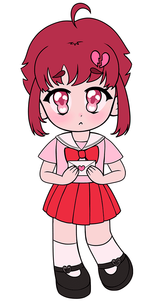 Heart (red and pink) symbolizes my high school years. I actually had that anime-inspired haircut and rocked it, but it was also a tough time in my life, which is why she doesn’t look too happy.